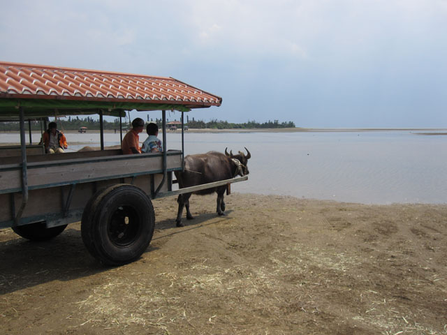 竹富でも牛車は見たけど乗らなかったし、丁度いい。 島唄を聞きつつ浅瀬を渡る。